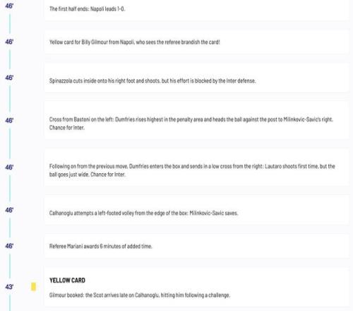 北京時間10月26日,在意甲第8輪的焦點戰中,那不勒斯依靠一粒爭議點球在半場過后主場1-0領先于國際米蘭,除了點球判罰以外,意甲官網的文字直播也給前45分鐘的比賽進一步增加了話題性。