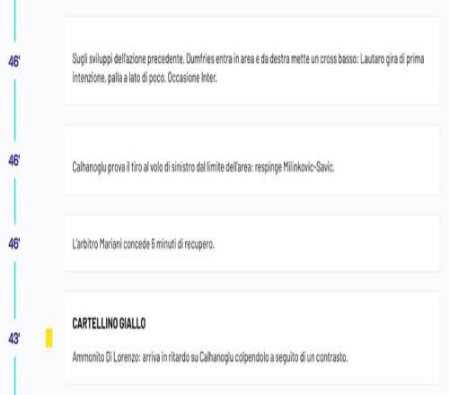 比賽的轉播畫面和意甲官網的文字直播原本都顯示吉爾摩在第43分鐘飛鏟恰爾汗奧盧犯規吃到黃牌,隨后第46分鐘這位蘇格蘭球星又拉倒鄧弗里斯破壞國米反擊再次染黃,正當人們困惑為什么當值主裁馬里亞尼沒有向吉爾摩出示紅牌的時候,意甲官方隨后對他們的文字直播內容進行了更正,他們將第一張黃牌的得牌球員更改為了迪洛倫佐。