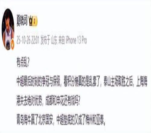 山東媒體人夏曉司老師直言有點亂:“中超最后時刻的爭冠與保級,看積分榜真的是亂套了,泰山主場取勝之后,上海海港失去絕對優勢,成都和申花還有戲嗎?青島海牛贏了北京國安,中超墊底的又成了梅州和亞泰。