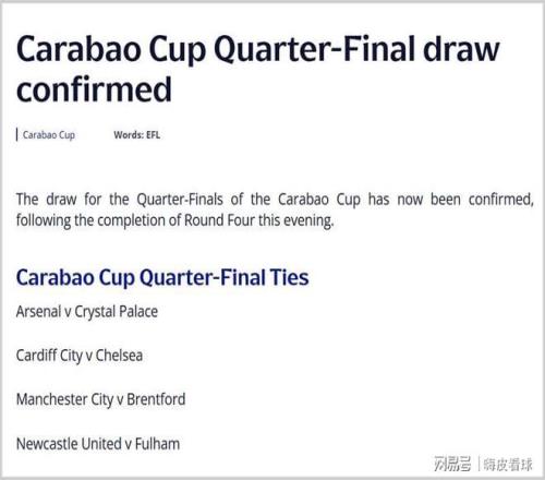 根據(jù)聯(lián)賽杯官網(wǎng)的消息,八強對陣形勢分別為,阿森納面對水晶宮,卡迪夫城面對切爾西,曼城面對布倫特福德,衛(wèi)冕冠軍紐卡斯?fàn)柮鎸Ω焕漳罚罢邽橹鲌觯才旁?2月17日的那個周中,具體的比賽時間待定。