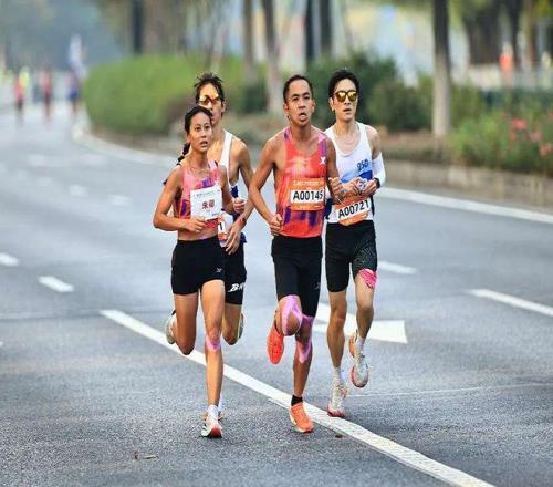 國際精英組成的第一集團出發的配速很快,黃雪梅自己以325-326配速跟了兩公里后,就慢下來了,她邊跑邊等著從后面出發的丈夫陳志明追上來。隨后,倆人以330左右的配速并肩前行。