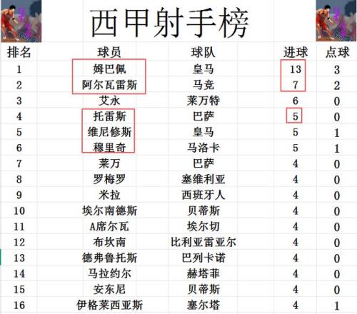 射手榜方面,姆巴佩氣勢如虹,13球高居榜首,阿爾瓦雷斯落后姆巴佩6球排在第2,艾永6球排在第3。托雷斯今天打入一球,追上維尼修斯和穆里奇,三人5球并列第4。萊萬,安東尼,馬拉約爾,A席爾瓦等人4球剛好擠入前十。