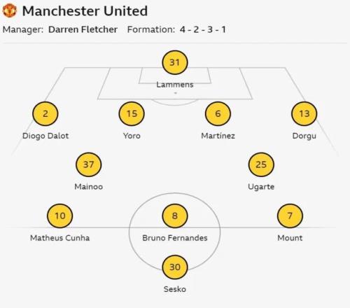 臨時(shí)主帥達(dá)倫·弗萊徹對(duì)陣容進(jìn)行一定輪換,埃登·海文、盧克·肖和卡塞米羅輪休,萊尼·約羅、科比·梅諾和梅森·芒特得以首發(fā),帕特里克·多古回到邊后衛(wèi)位置。弗萊徹的一對(duì)雙胞胎兒子杰克和泰勒都坐在替補(bǔ)席上。