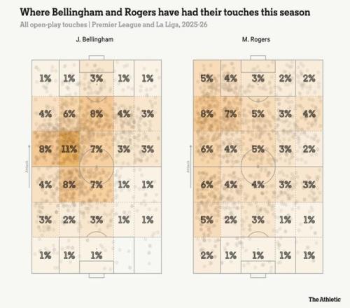 貝林厄姆尚未找回他在2023-24賽季的進攻巔峰狀態——當時他在28場西甲比賽中打進19球。上賽季他僅有9球入賬,本賽季至今也只有4球,不過這其中存在一些客觀因素。他因肩傷恢復而推遲開啟賽季,同時從下方觸球熱區圖可以看出,他承擔了比羅杰斯更多的防守任務,在進攻三區的觸球比例低了11個百分點。