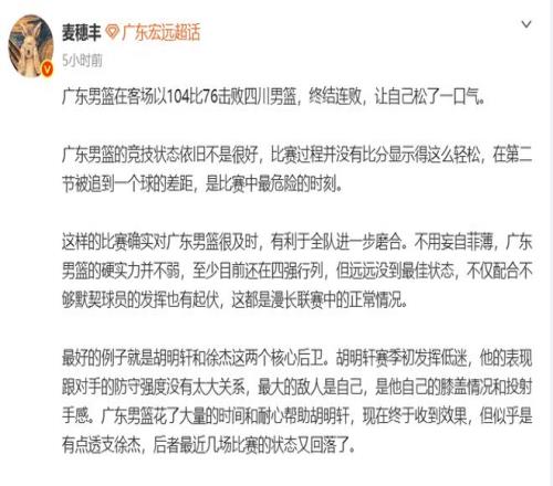 對于胡明軒和徐杰兩種截然不同的場上表現,麥老師表示:胡明軒賽季初發揮低迷,他的表現跟對手的防守強度沒有太大關系,最大的敵人是自己,是他自己的膝蓋情況和投射手感。廣東男籃花了大量的時間和耐心幫助胡明軒,現在終于收到效果,但似乎是有點透支徐杰,后者最近幾場比賽的狀態又回落了。