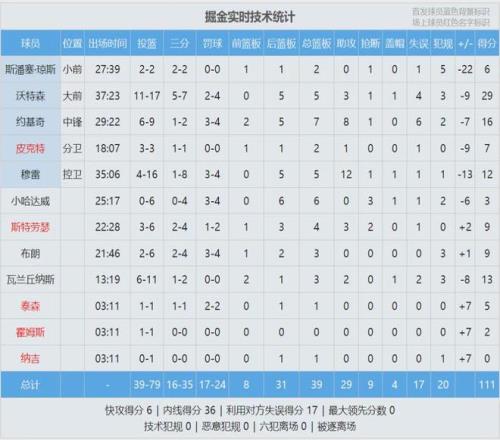 卡森-華萊士三分11中7砍下27分6板2斷,得分和三分命中數(shù)都是生涯最高。掘金全場比賽從未領(lǐng)先過,此役過后跌至西部第三。最后看看數(shù)據(jù):
