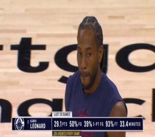 過去26場,倫納德全部得分20+,場均29.1分,命中率50/39/93%