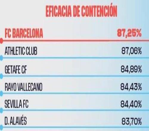 巴薩在防守中成功阻止對手完成射門的比例為87.25%,領先于畢爾巴鄂競技(87.06%)和赫塔費(84.89%),成為阻止對手進攻的最佳球隊。