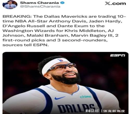 "轟!"當Shams的爆料如驚雷般炸響,整個籃球世界瞬間沸騰——獨行俠竟將濃眉哥安東尼·戴維斯、拉塞爾、哈迪和埃克薩姆打包送往華盛頓,換回米德爾頓領銜的七人豪禮(含5個選秀權)!這記堪比好萊塢大,讓無數球迷扼腕嘆息:我們終究無緣見證歐文(2011狀元)+弗拉格(2025狀元熱門)+濃眉哥(2012狀元)的夢幻三狀元組合!