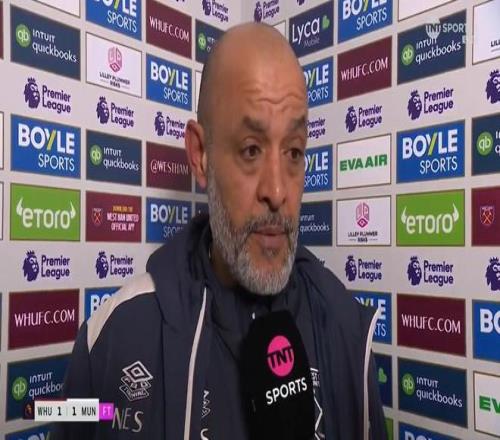 英超第26輪一場較量,西漢姆聯(lián)主場被曼聯(lián)絕平。賽后,鐵錘幫主帥努諾接受了TNT體育的采訪。