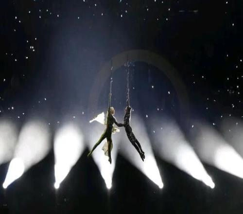 舞蹈《城市與高山》,分別象征米蘭和科爾蒂納的舞者站在圓環(huán)中間緩緩升起,最終在高空中相擁,象征人與自然的和諧共生。