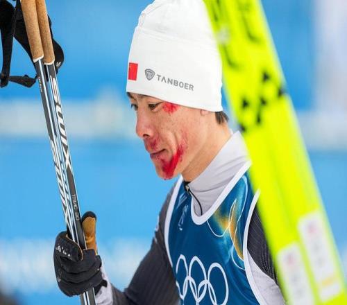 趙子賀在越野滑雪階段的下坡路段因速度過快不慎摔倒,面部大面積擦傷、血跡明顯,但他頑強堅持完成比賽。沖過終點線時,全場觀眾以熱烈掌聲向他致意。