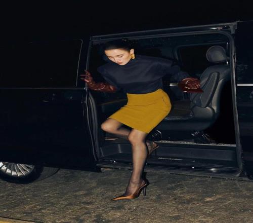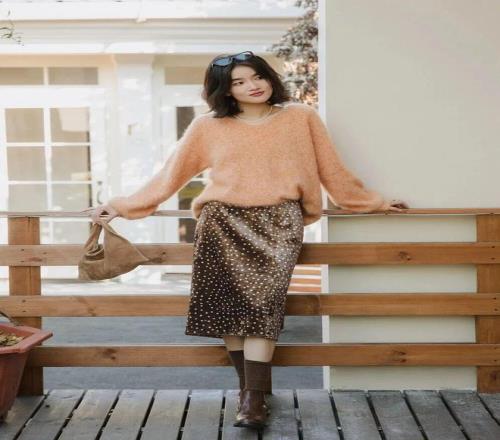 達妹也穿過類似的搭配:棕色麂皮外套+橙色緞面連衣裙,明媚得讓人眼前一亮。▼