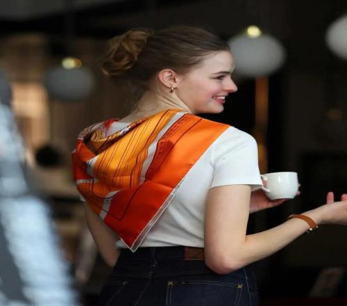 如果想要更低調/更好駕馭的組合,可以試試橙色絲巾,搭配棕色皮革小單品,比如皮手表、皮包。