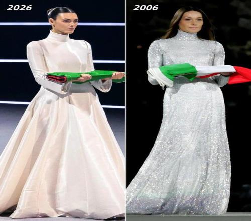 “小李子女友”超模Vittoria Ceretti手捧國旗入場(左),造型致敬了20年前同樣擔任護旗手的超模Carla Bruni(右),兩人都身著阿瑪尼高定(Armani Privé)。▼