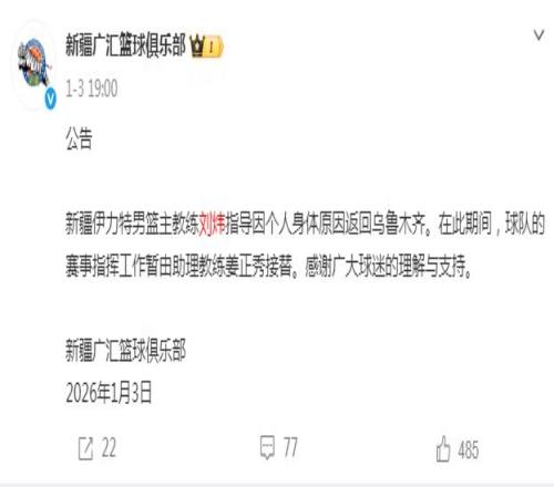新疆伊力特男籃主教練劉煒指導(dǎo)因個(gè)人身體原因返回烏魯木齊。在此期間,球隊(duì)的賽事指揮工作暫由助理教練姜正秀接替,感謝廣大球迷的理解與支持。