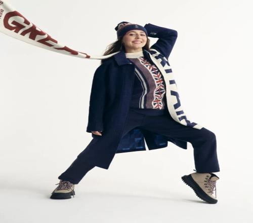 Adidas 負責競技裝備與功能結(jié)構(gòu),將英國國旗 Union Jack 圖案進行結(jié)構(gòu)性解構(gòu),使其融入冬季運動服廓形之中,而非簡單的平面印花。色塊拼接與幾何切割讓視覺更具速度感,也強化了競技氛圍。
