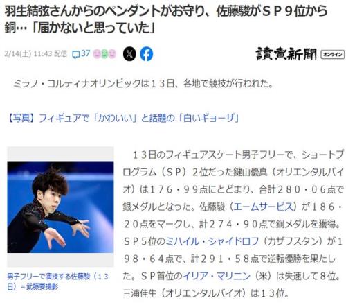佐藤駿跟羽生結弦一樣是仙臺人,他小時候就是因為崇拜羽生結弦才進入的花滑世界。賽后他表示從羽生前輩那里得到的吊墜代替了護身符陪伴在身邊,在前幾天短節目失誤后也是看著前輩的傳奇表演“晴明”受到鼓舞才拿下的這枚銅牌。
