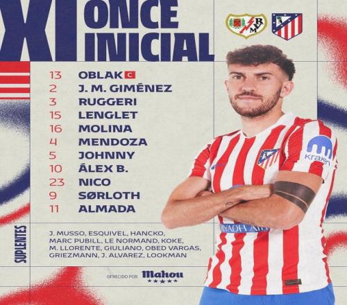 馬德里競技首發:13-奧布拉克、2-希門尼斯、3-魯杰里、15-朗格萊、16-莫利納、4-門多薩、5-卡多佐、10-巴埃納、23-尼古拉斯-岡薩雷斯、9-瑟洛特、11-阿爾馬達