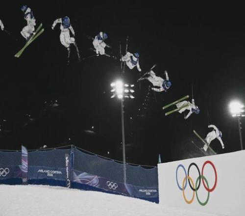 2月14日,中國選手谷愛凌在女子大跳臺資格賽中(多重曝光照片)。新華社發
