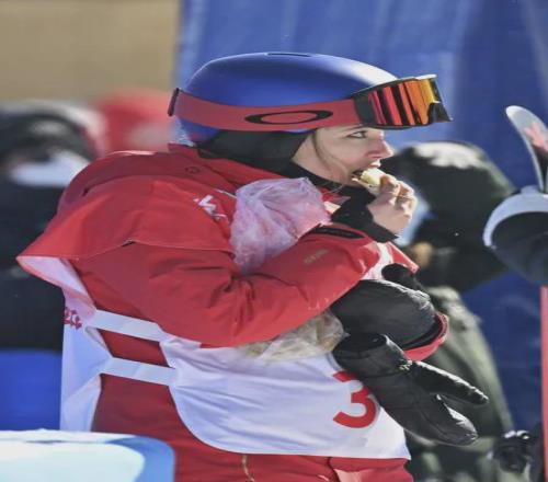 在北京2022年冬奧會自由式滑雪女子坡面障礙技巧資格賽中,中國選手谷愛凌在等待裁判打分時吃韭菜盒子。新華社發