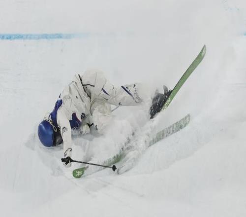2月14日,中國選手谷愛凌在女子大跳臺資格賽中摔倒。新華社發
