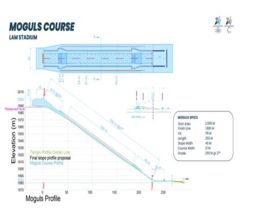 賽道長(zhǎng)度被嚴(yán)格規(guī)定不能少于250米(普通國(guó)際賽事范圍通常在235米±35米),平均坡度要維持在28°±4°,斜面上均勻分布著密集的雪包, 雪包之間的中心距離通常設(shè)定在3.5米至4米之間,這個(gè)距離是根據(jù)頂尖選手的滑行速度(男選手約11-12米/秒,女選手約10米/秒)計(jì)算出來(lái)的。除了連貫的雪包,賽道還嵌入了兩個(gè)關(guān)鍵的空中動(dòng)作跳臺(tái)。第一個(gè)跳臺(tái)位于賽道總長(zhǎng)約15%處,第二個(gè)則設(shè)在離終點(diǎn)約20%處。|奧運(yùn)會(huì)官網(wǎng)