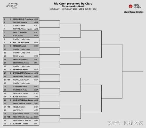 ATP500巴西里約站:前四號(hào)種子分別是F-塞倫德羅、達(dá)爾德里、豐塞卡、巴埃斯。貝雷蒂尼、埃切維里、塔比洛等球員也將連續(xù)兩周出戰(zhàn)。