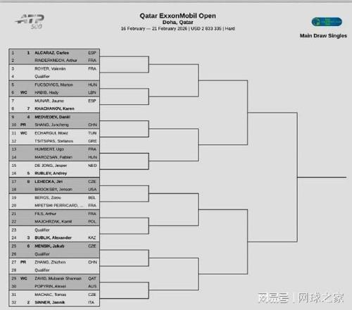 我們?cè)賮?lái)關(guān)注下周賽事:北京時(shí)間昨晚,下周開(kāi)打的三站ATP賽事相繼公布了正賽簽表。ATP500卡塔爾多哈站:阿爾卡拉斯、辛納、布勃里克三位TOP10領(lǐng)銜,盧布列夫開(kāi)啟衛(wèi)冕之旅,門(mén)希克、卡恰諾夫、西西帕斯等名將參賽。中國(guó)有兩位球員出戰(zhàn),其中,商竣程首輪對(duì)陣俄羅斯名將梅德維德夫;張之臻迎戰(zhàn)一位資格賽球員。