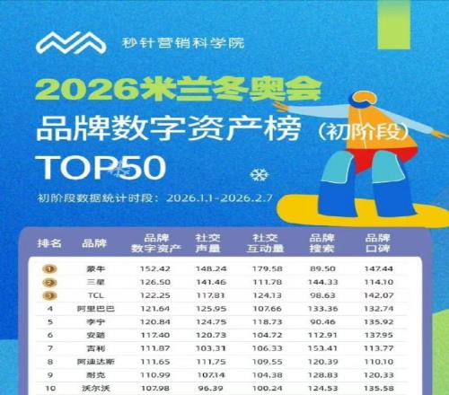 當米蘭冬奧會與中國春節在同框,品牌營銷的戰場比賽場更早進入決賽圈。有人豪擲資源傾注,有人押注明星流量,大家都在拼誰能在雙節點的情緒共振中搶到C位——直到秒針營銷研究院一份《2026米蘭冬奧初階段品牌數字資產榜》的發布,這場混戰才有了第一個被數據蓋章的答案。