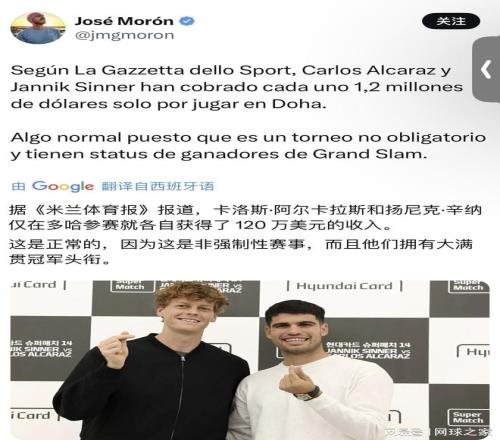 據(jù)《米蘭體育報》等多家媒體報道,阿爾卡拉斯和辛納兩人僅憑借在本周ATP500多哈站的出場,各自就有高達120萬美元入賬。