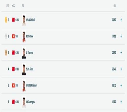 第二輪里,孫佳旭率先起跳,獲得123.42分。隨后李天馬跳出123.93分,王心迪更是完美一跳拿到132.60分,三人一度占據前三名!可惜齊廣璞失誤,最終只獲得81分。瑞士選手維爾納同樣失誤僅獲得99.32分。