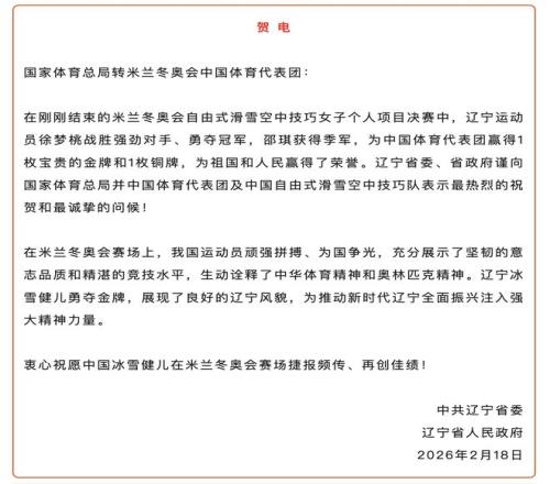 2月18日,遼寧省委省政府發賀電:在剛剛結束的米蘭冬奧會自由式滑雪空中技巧女子個人項目決賽中,遼寧運動員徐夢桃戰勝強勁對手、勇奪冠軍,邵琪獲得季軍,為中國體育代表團贏得1枚寶貴的金牌和1枚銅牌,為祖國和人民贏得了榮譽。遼寧省委、省政府謹向國家體育總局并中國體育代表團及中國自由式滑雪空中技巧隊表示最熱烈的祝賀和最誠摯的問候!