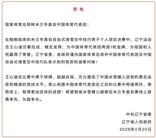 2月20日,遼寧省委省政府發賀電:在剛剛結束的米蘭冬奧會自由式滑雪空中技巧男子個人項目決賽中,遼寧運動員王心迪沉著應戰、穩定發揮,為中國體育代表團再添1枚金牌,為祖國和人民贏得了榮譽。遼寧省委、省政府謹向國家體育總局并中國體育代表團及中國自由式滑雪空中技巧隊表示熱烈祝賀和誠摯問候!