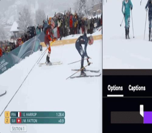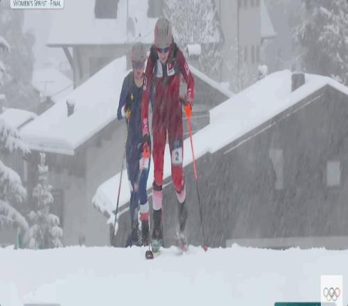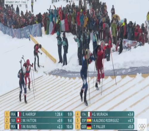 世錦賽三冠王、身穿藍(lán)衣頭戴灰粉色頭盔法國(guó)名將埃米莉·哈羅普無(wú)疑是女子短距離比賽的奪冠最大熱門(mén),第一賽段和第二賽段的配速都遙遙領(lǐng)先,但是在轉(zhuǎn)換區(qū)穿板時(shí)她出現(xiàn)了明顯失誤,被瑞士選手、世錦賽雙冠王,身穿紅衣腳踩黃色雪板的瑪利亞內(nèi)-法頓超越。