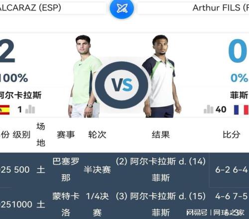 年輕的阿爾卡拉斯和菲斯,職業(yè)生涯在去年有過(guò)兩場(chǎng)交鋒。第一次發(fā)生在蒙特卡洛大師賽1/4決賽,阿爾卡拉斯以4:6的比分輸?shù)舻谝槐P(pán),第二盤(pán)先后挽救了七個(gè)破發(fā)點(diǎn)(包括5:5之后的第11局0:40面臨三個(gè)連續(xù)的破發(fā)點(diǎn)),才以7:5的比分艱難扳回一盤(pán),最后的決勝盤(pán)又在1:3落后的危境下連勝五局,逆轉(zhuǎn)淘汰了菲斯。第二次發(fā)生在背靠背的ATP500巴塞羅那站半決賽,阿爾卡拉斯兩盤(pán)輕松過(guò)關(guān)。