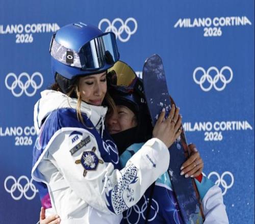 谷愛凌(左)、李方慧在比賽后擁抱慶祝。新華社發