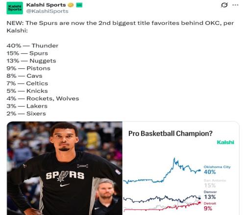 在常規賽進入沖刺階段,預測平臺Kalshi Sports更新NBA本季奪冠概率,其中火箭4%并列第八,湖人3%勇士落選,榜首40%斷檔領先。