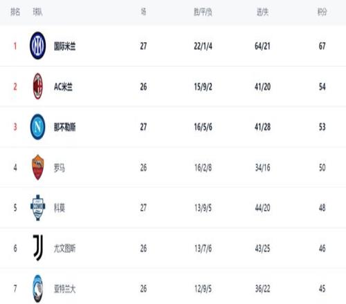 在積分榜上,國際米蘭以絕對優(yōu)勢占據(jù)榜首位置。國際米蘭22勝1平4負(fù),拿到67分。而排名第2的AC米蘭只拿到54分,足足落后國際米蘭13分。這樣的差距太驚人了。顯然,國際米蘭已經(jīng)無限接近冠軍了。那不勒斯贏球之后,總積分達(dá)到53分,排名第3。第4的是羅馬,拿到50分。科莫贏球之后,總積分達(dá)到48分,超越了尤文圖斯,升到第5名。而只拿到46分的尤文圖斯掉到第6名。
