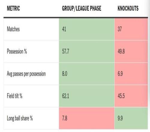 下表比較了在維尼修斯出戰的歐冠比賽中,球隊在小組/聯賽階段與淘汰賽階段的數據。皇馬在控球率、每次控球平均傳球次數和場地傾斜度(進攻三區觸球占比,反映場面上占優程度的指標)上均有下降,同時長傳占比有所增加。