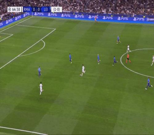 當維尼修斯能與隊友配合并前插身后時,他在肋部區域就能構成威脅,就像下圖中他在2021-22賽季四分之一決賽對陣切爾西時助攻本澤馬那樣。