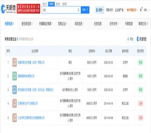 天眼查任職信息顯示,王濛名下關(guān)聯(lián)5家企業(yè),包括灣道體育文化傳播(北京)有限公司、海南陌銘科技有限公司、弟兄姐妹文化傳播(北京)合伙企業(yè)(有限合伙)等,王濛在上述企業(yè)中擔(dān)任法定代表人、執(zhí)行董事兼總經(jīng)理職務(wù),版圖涉及體育文化、科技等領(lǐng)域。