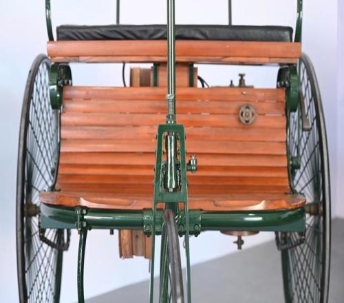 Benz Patent,1886。1886年,卡爾·本茨試制了一臺單缸四沖程汽油機,并安裝在由鋼管和木板構成的三輪車架上。該車采用了鋼條幅輪圈和實心橡膠輪胎,通過轉動手柄帶動齒輪來完成轉向,發動機經過傳動帶機構和鏈條驅動后輪,速度可達到15公里/小時。
