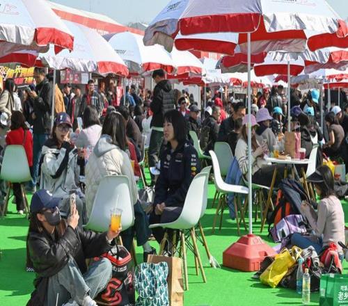 2026年3月13日,如潮般的游客在上賽場外的汽車文化節場地享受美食,等待下午F1賽開始。