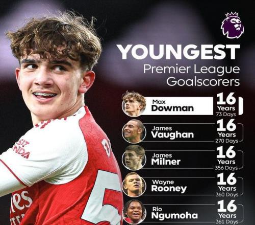 英超聯(lián)賽至今,能在16歲取得聯(lián)賽進(jìn)球的僅有5人,而道曼直接將原有的英超最年輕進(jìn)球者紀(jì)錄大幅提前了將近兩百天!