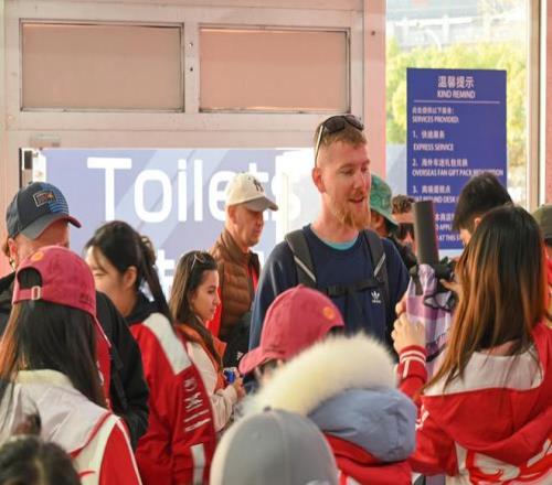 2026年3月13日,上賽場外的賽事紀念品商店,來自全球各地的車迷正排隊領取禮包。澎湃新聞記者 吳棟 圖