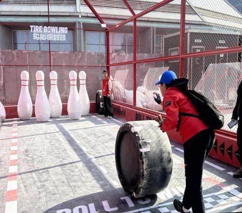 2026年3月11日,上海西岸的格子旗嘉年華設置了多項趣味游戲。圖為一名女士正在體驗輪胎保齡球。澎湃新聞 實習生 楊溜 圖