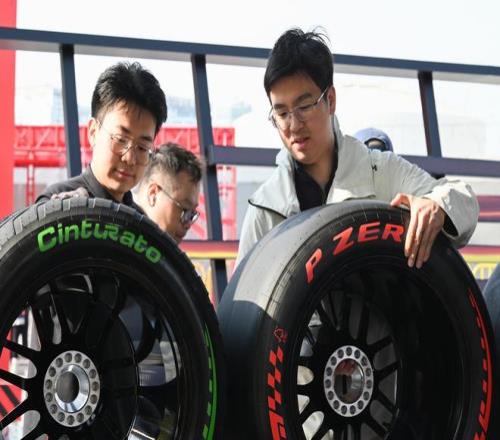 2026年3月11日,上海西岸的格子旗嘉年華上,車迷們近距離接觸F1輪胎。澎湃新聞記者 吳棟 圖