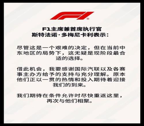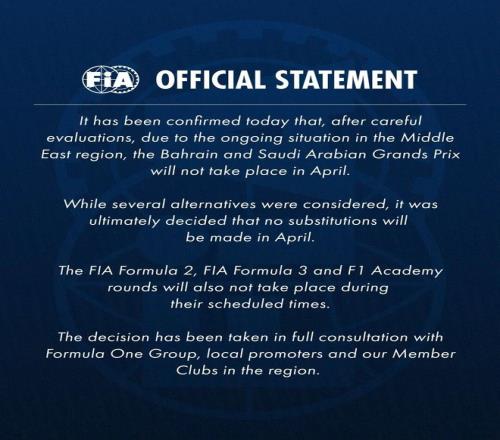 就在今天上午,F1官方確認了本賽季巴林和沙特阿拉伯大獎賽將不會在四月進行。官方聲明中表示,由于受中東地區當前局勢影響,原定的F1連同F2、F3和F1學院賽事將不會如期舉行。盡管考慮了其他備選方案,但四月將不會安排替代賽事。