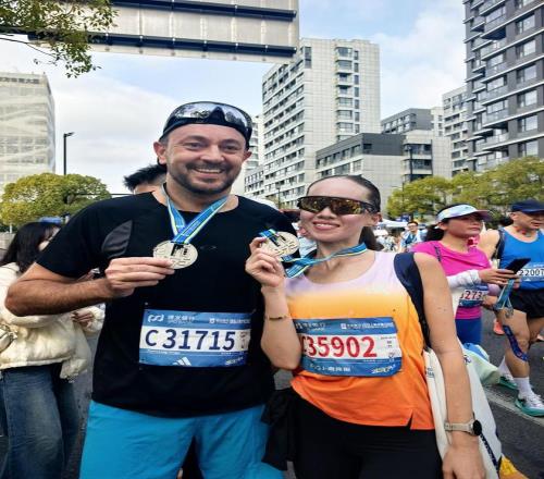 意大利夫婦彼得羅(Pietro)和阿里別克(Alibek)已在上海居住11年,丈夫彼得羅堅持跑步14年,卻是第一次參加上海半馬,“上海更平坦,可以跑得更快,組織得特別棒,所有人都非常友好。”這樣的比賽體驗,也讓他們對于12月再戰上海馬拉松充滿期待。